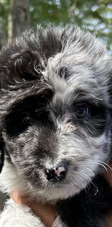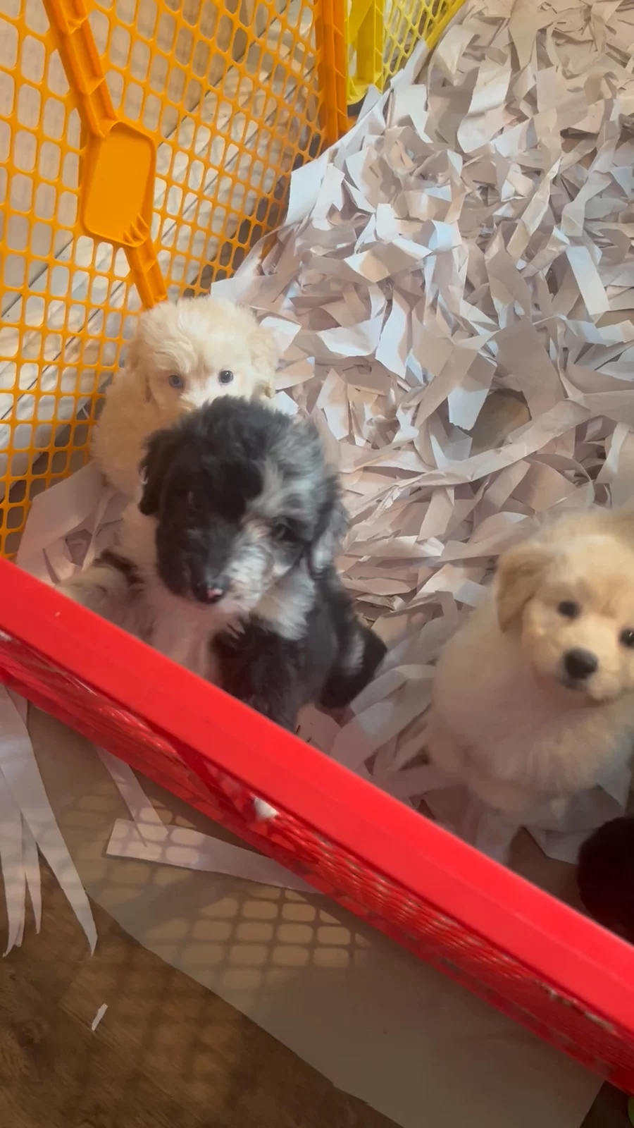 Our Aussiedoodle puppies include blue merle, red merle, and black and white. Poodle puppies include black, blue, and cream. Miniature Australian Shepherd puppies include black tri and red tri. Colors will vary depending on the parent dogs.