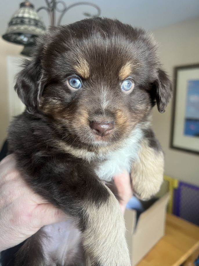 Ellie is a beautiful blue Merle female Australian Shepherd with tan points. She loves to go for hikes and play ball