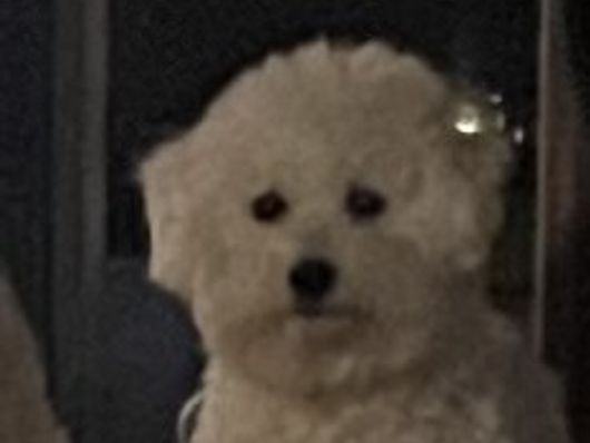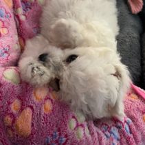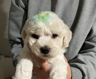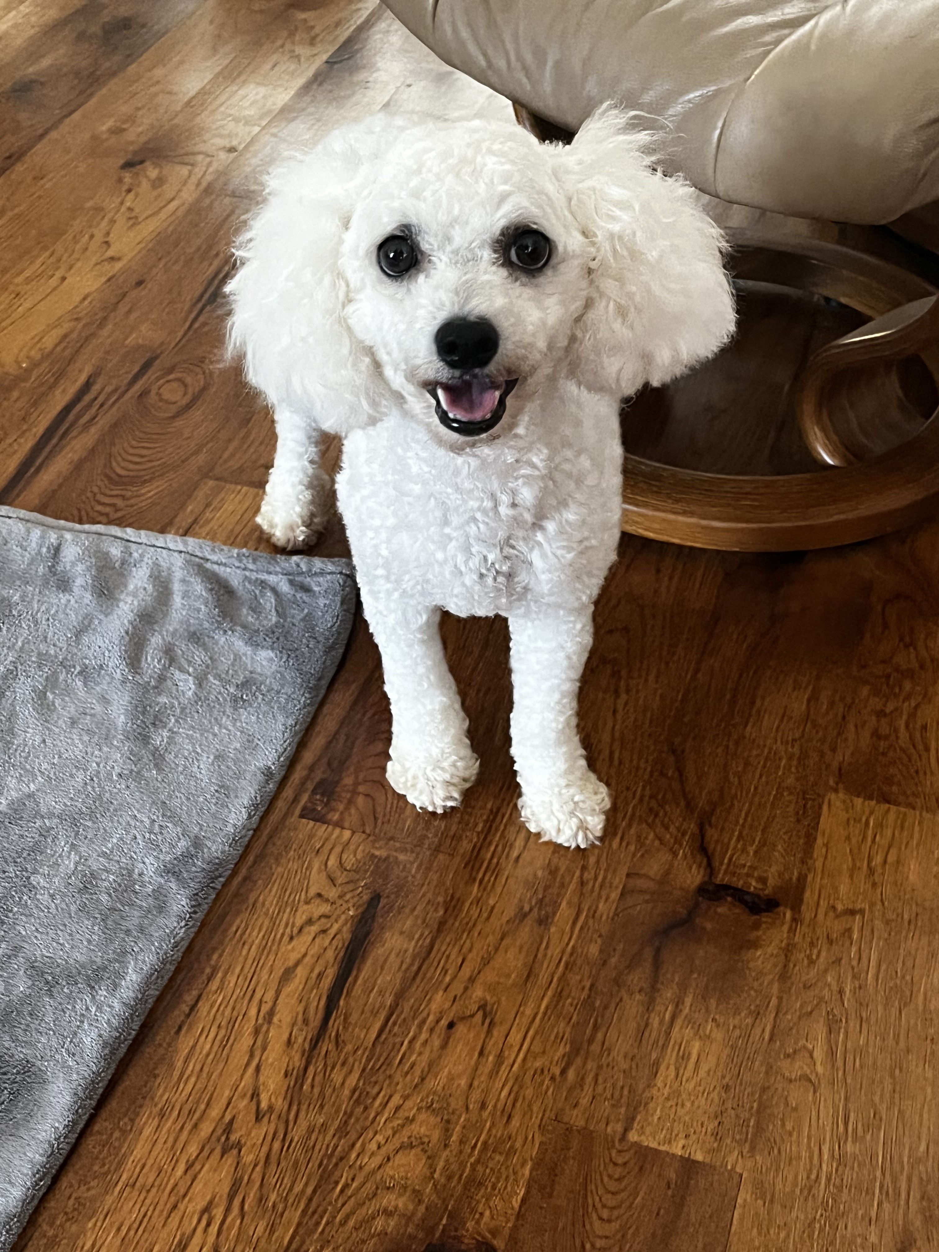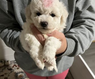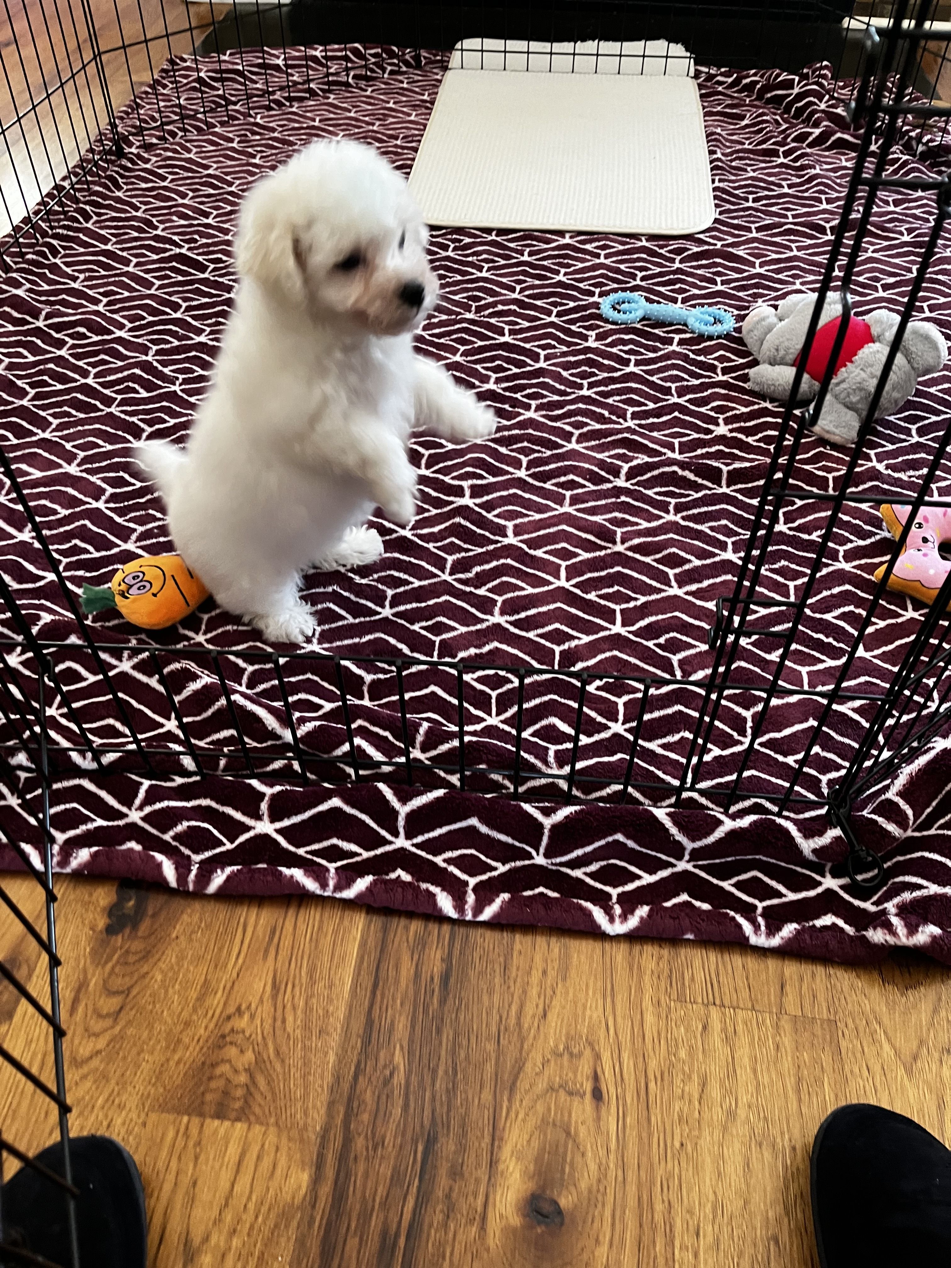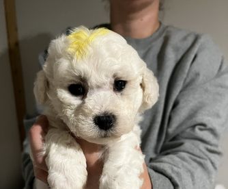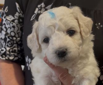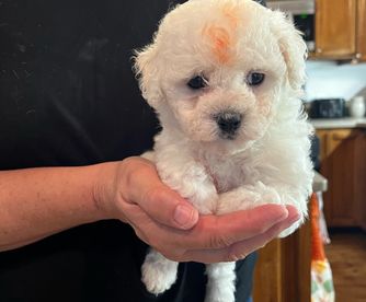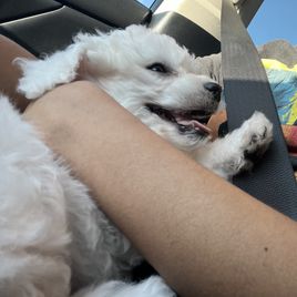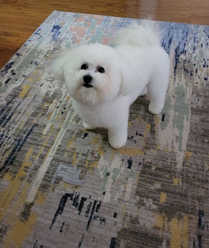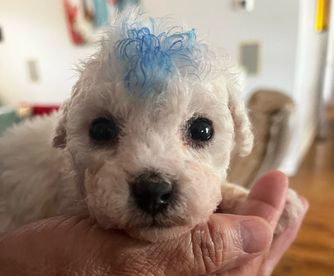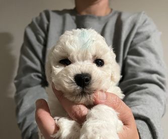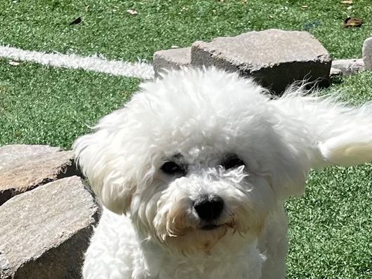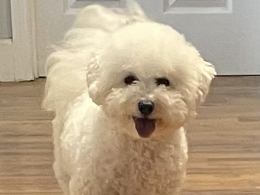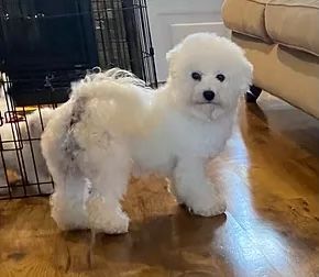 Bubbles is a sweet girl. She is an experienced mother. She is on the tall side for a Bichon, but still within the standard.