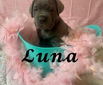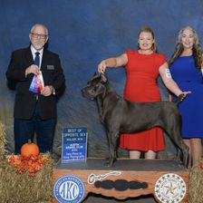 Luna earned her AKC Championship in September of 2025 at 18 months old! In October she won Select Bitch at the Cane Corso specialty and is now only 2 points away from her Grand Championship. She’s a beloved pet to 4 children ages 3-13. She has the best temperament just like her parents!