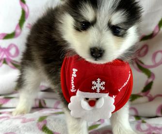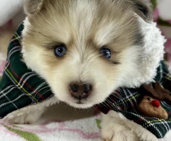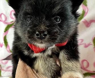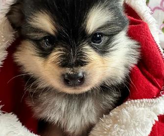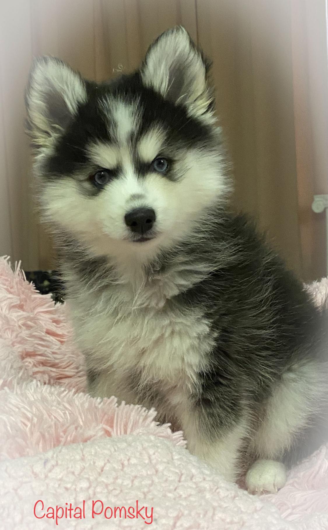 Our Pomeranian puppies include black and blue. Pomsky puppies include white, black and white, and merle. Colors will vary depending on the parent dogs.