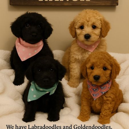 Goldendoodle puppies include cream, apricot, and black. Labradoodle puppies include caramel red, apricot, and black. Colors will vary depending on the parent dogs.