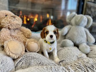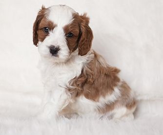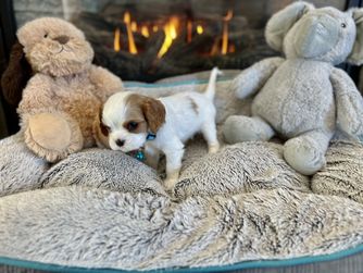 Our Cavapoo puppies include white, cream, chocolate, apricot, and blenheim. Cavalier King Charles Spaniel puppies are blenheim. Colors will vary depending on the parent dogs.