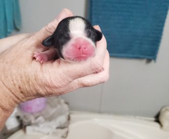 She is black with small spots of white on her chest and tips of her feet. She is a very loving dog and has a wonderful personality. She has had DNA testing through wisdom and is free of all congenital defects.