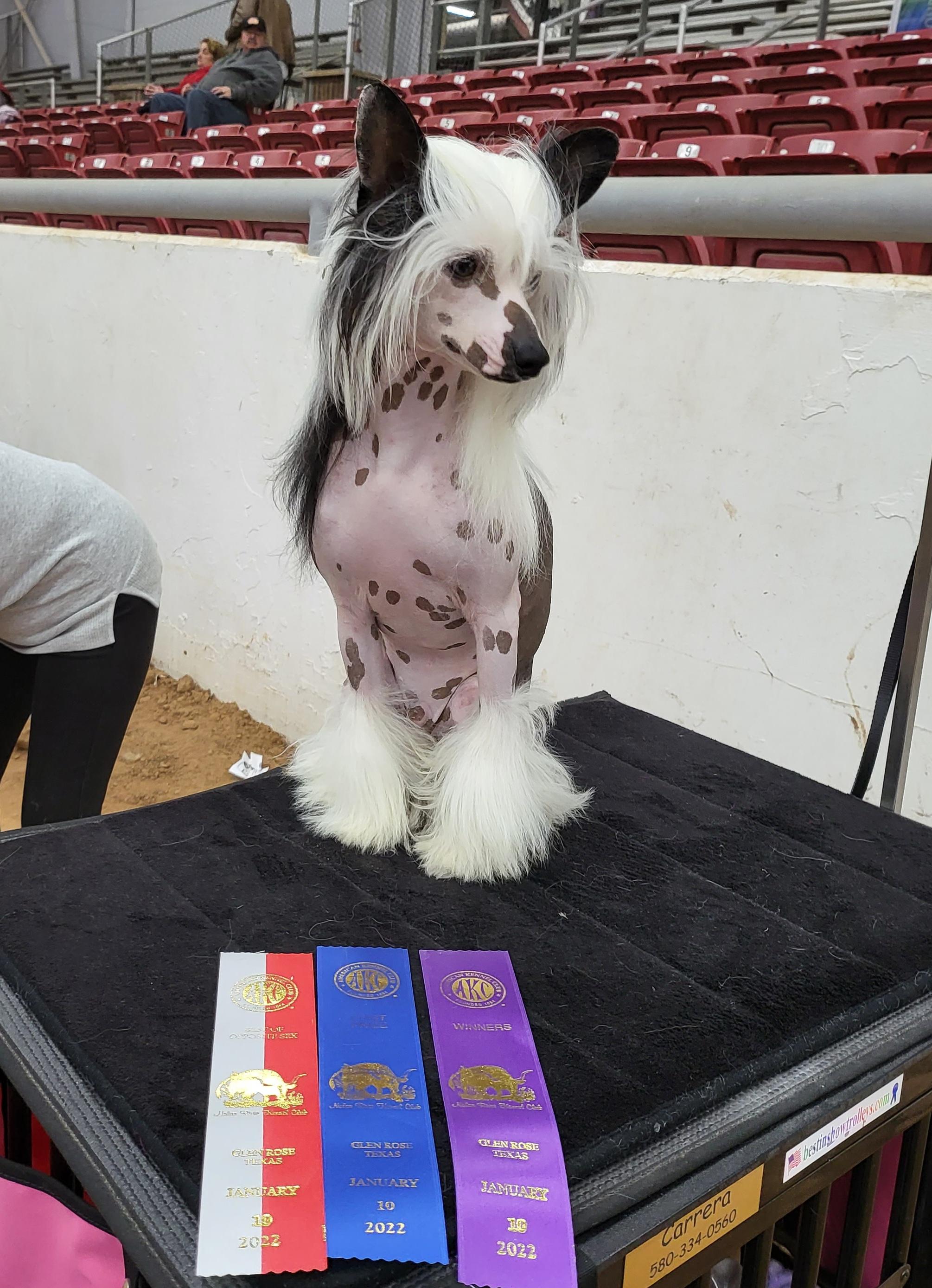 I'm Susan A., the breeder behind Carrera Chinese Cresteds located in Laverne, OK. We are AKC Breeders of Merit and preservation breeders. Our dogs are wonderful representations of the breed and excel both in the ring and as beloved companions. We breed to help ensure the health and future of these wonderful dogs and are dedicated to responsible breeding, training, and rehoming.