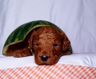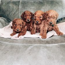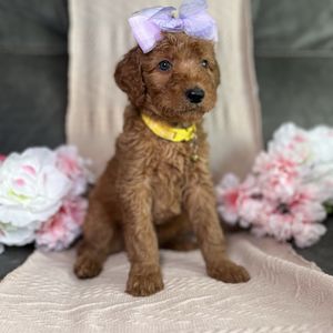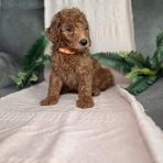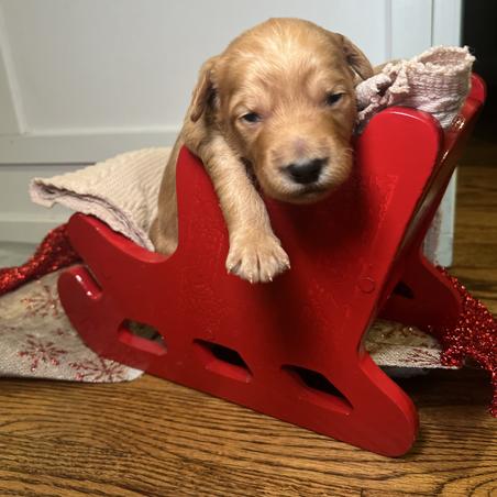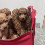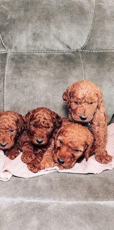 Our Goldendoodle puppies are red. Poodle puppies include apricot, black, brown, cafe au lait, cream, red, and white. Colors will vary depending on the parent dogs.