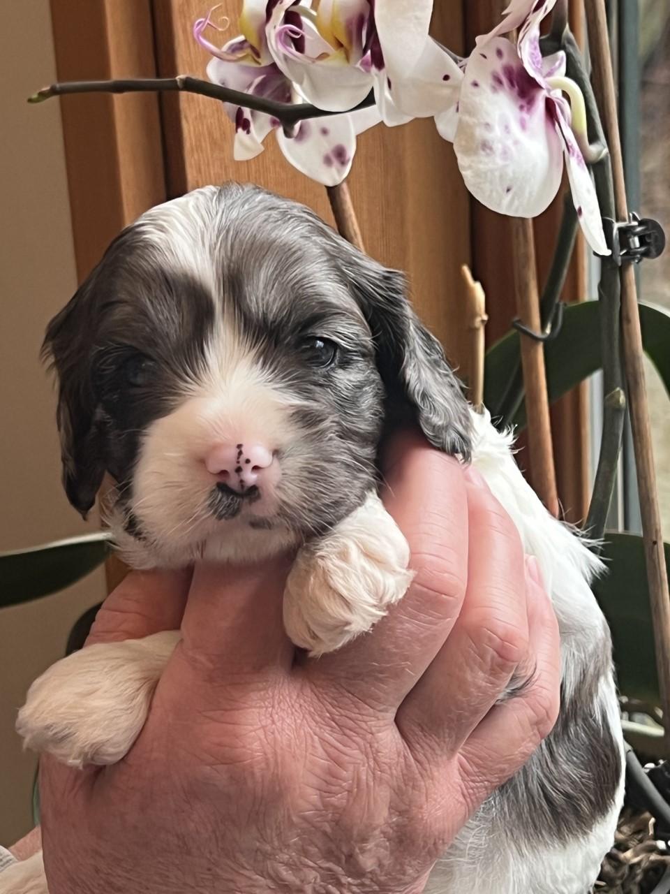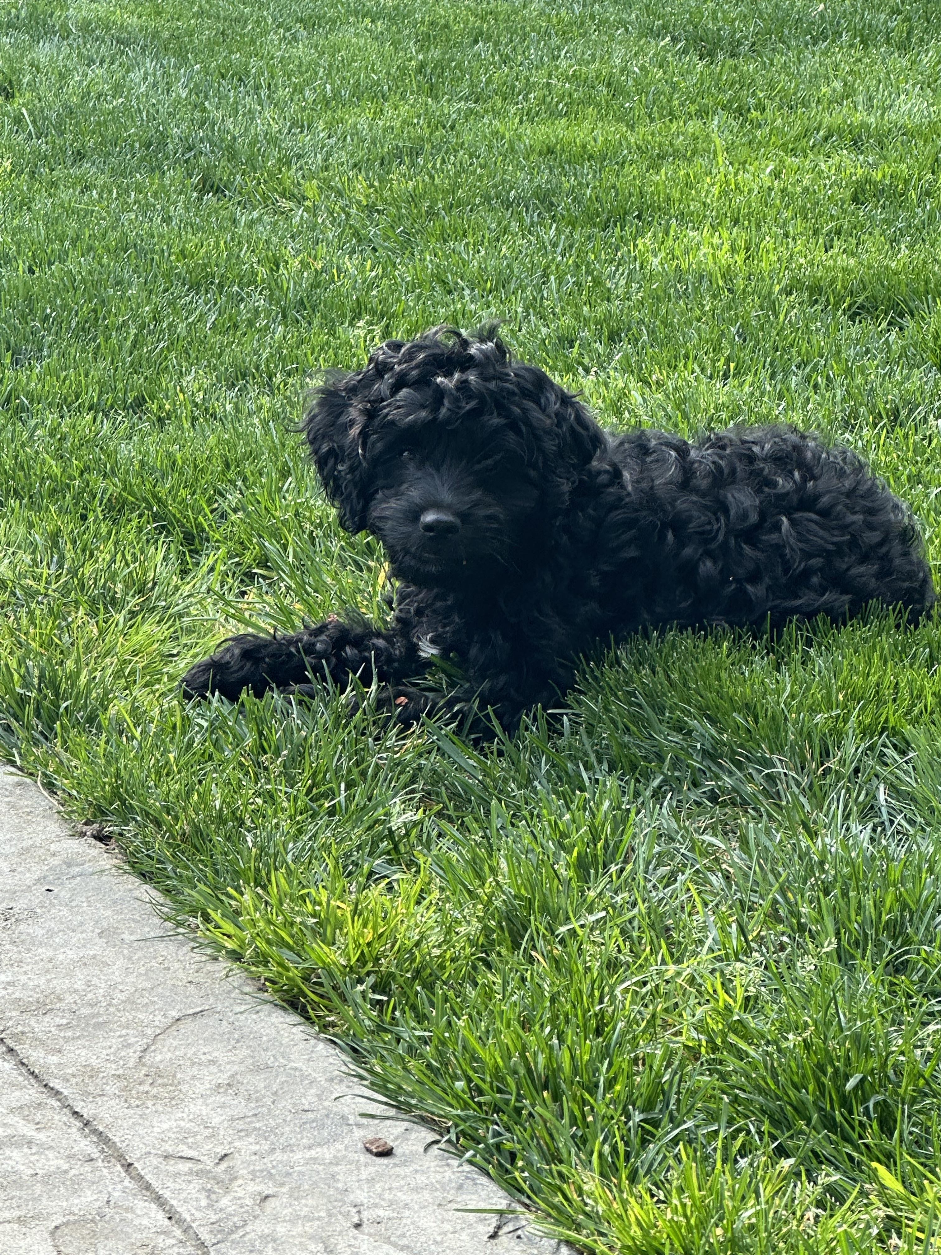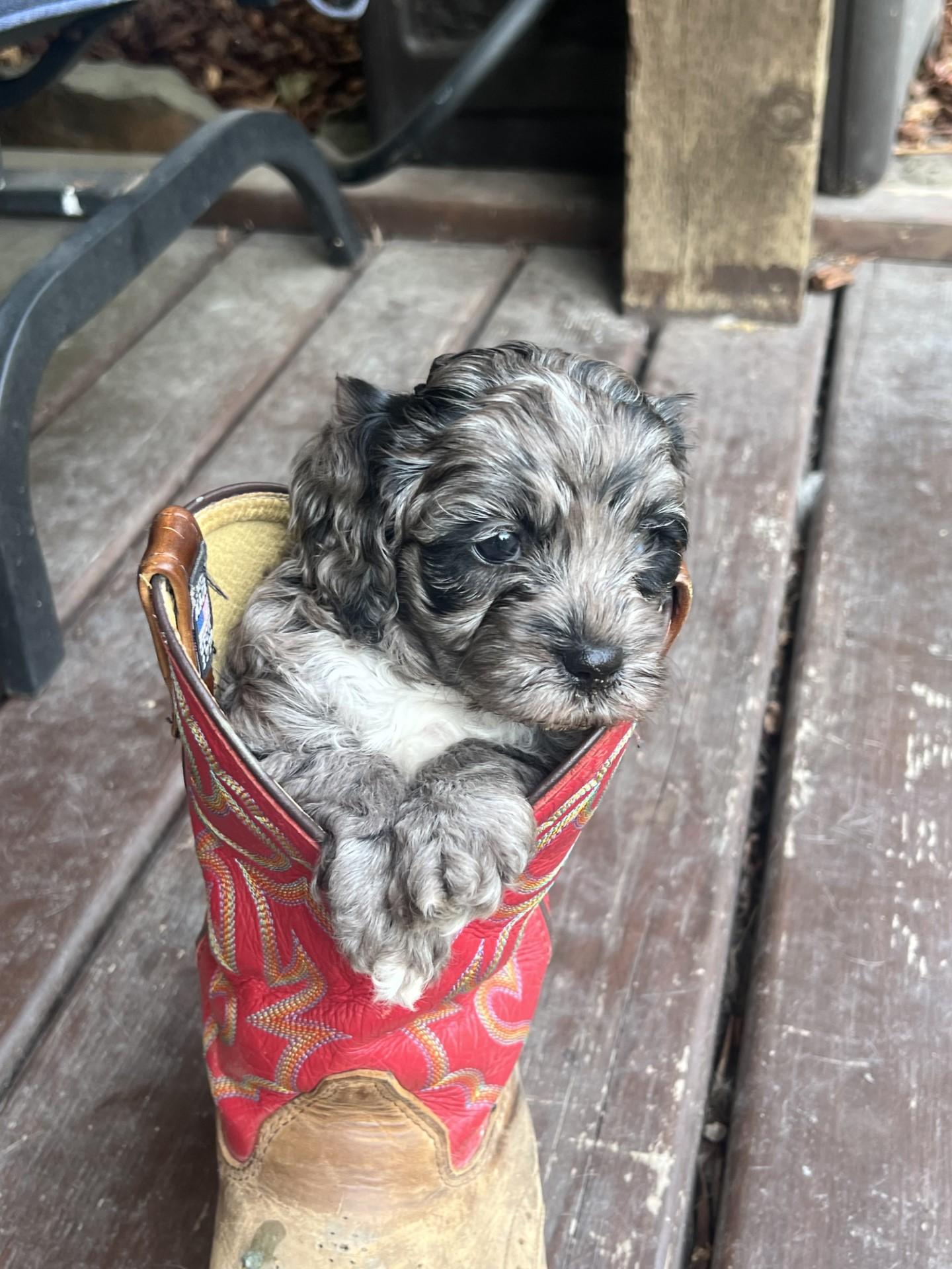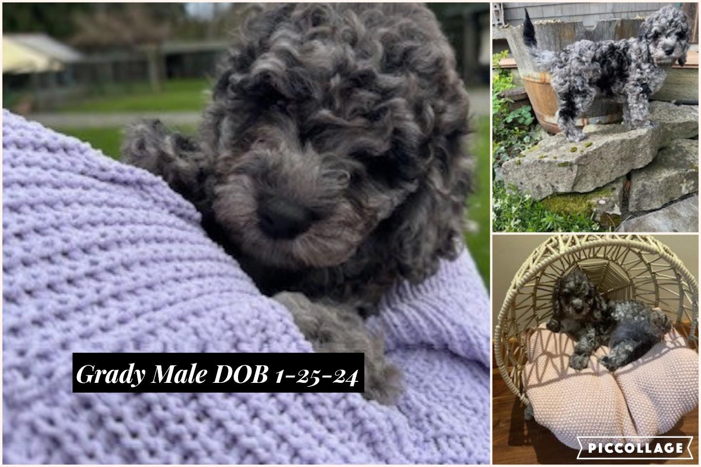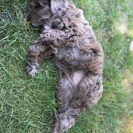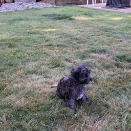 Charlie is sweet affectionate boy full of love and happy to be around anyone. Charlie is smart and is great dog with all ages of people and other dogs of all sizes. He has a very little to no shedding coat soft and curly. His Merle colors are so beautiful! Charlie has proven to be a very healthy male and a great stud.