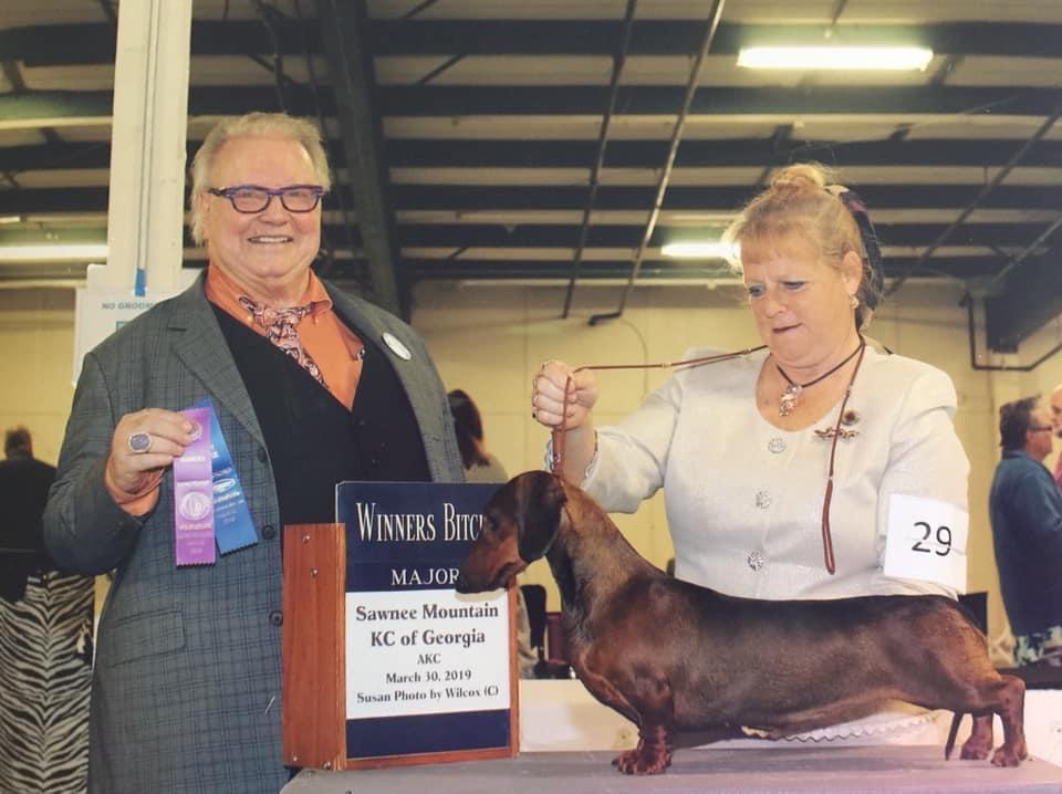 As a kid my parents bred and hunted beagles, my mother continued with dachshunds, when I got married we got into Great Danes and Pomeranians, then took a break to have kids, 2016 we got our first standard dachshund males, and started showing, from there we got our first female standard showed her to a championship, and had our first breeding, she had a singleton and we are excited to see what she does in the ring and whelp box,