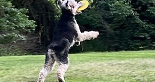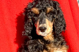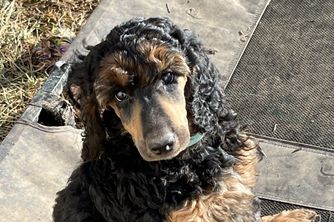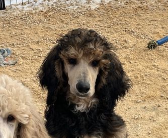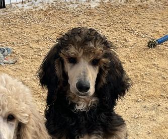 Riata is a black and cream Phantom standard poodle. She is AKC registered and has an excellent temperament, conformation, and coat. She is happy just being with us and doing everything we do, such as: frisbee, hiking, & exploring. She is eager to please, and extremely intelligent, which makes her easy to train and well-mannered. She has earned the AKC Canine Good Citizen and AKC Advanced Good Citizenship Titles.