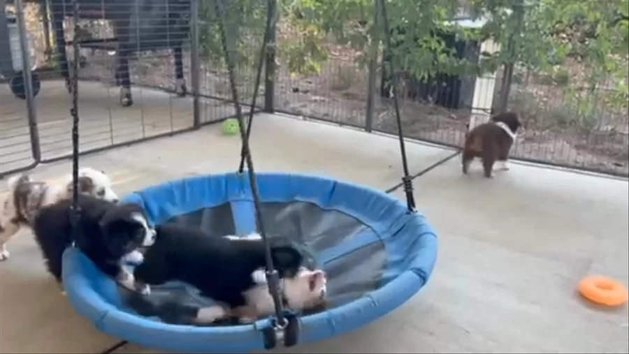 The puppy have a really nice out door play area with a swing and lots of toys ….when the is good they love laying in front of the cooler ….