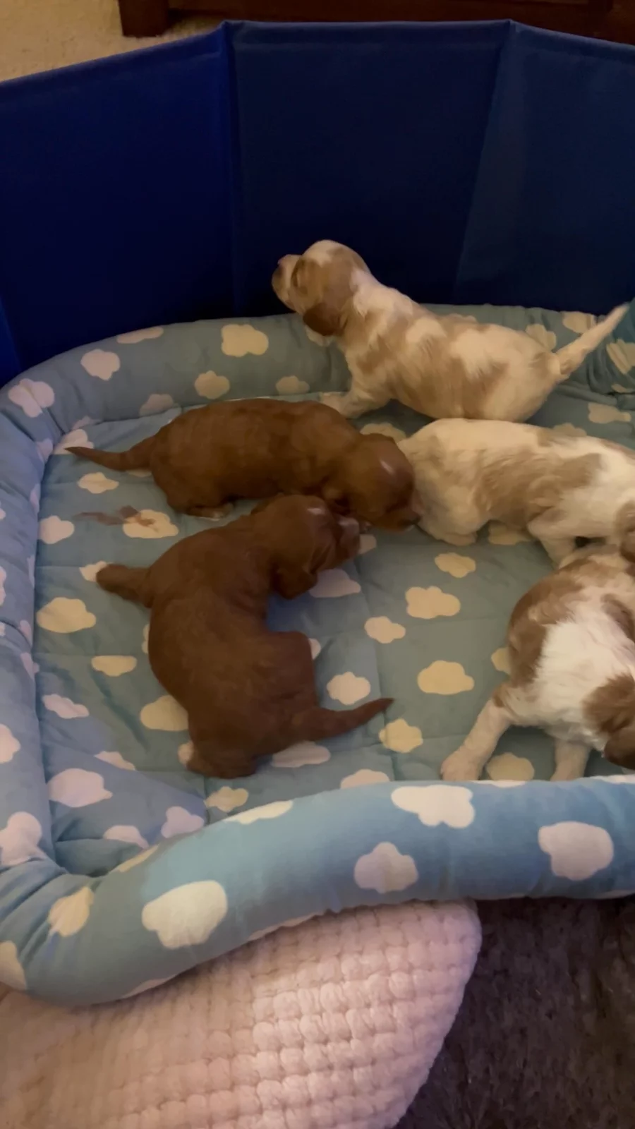 Puppies have arrived! Bella delivered her Spring litter on January 12, 2026. Whelping began at 8:28 AM and wrapped up at 11:40 AM. Both Bella and the puppies are doing wonderfully and are now resting comfortably. We have 6 puppies total: • 4 boys — 1 Red, 3 Blenheim • 2 girls — 1 Red, 1 Blenheim We are now accepting deposits for this litter. Puppy selection is made in the order deposits are received, and at this time first pick has already been reserved. Bella is being a very attentive mom, so we’ll give her a few days before taking individual photos. For now, we’re sharing a sweet picture of her with the whole litter. She went into labor early yesterday afternoon, and it was a long night of supporting her—my daughter and I camped out in the living room with her. Running on about 3–4 hours of sleep today, but our hearts are full. More updates and individual photos coming soon.