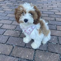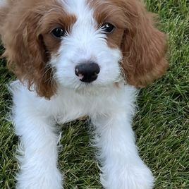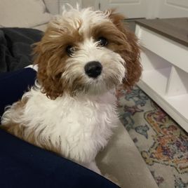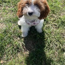 Simba is our handsome Blenheim Cavapoo sire with a gentle heart and playful charm. Weighing 14 lbs, he’s the perfect balance of cuddly companion and confident leader. Simba is affectionate, calm, and loves being around children—often found soaking up belly rubs or trotting happily alongside our family.