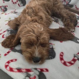Bella is our beloved red Miniature Poodle mama whose gentle spirit sets the tone for our entire puppy nursery. Weighing 15 lbs, she’s the perfect size for cuddles and companionship. Bella is affectionate, intuitive, and incredibly nurturing—not just with her pups, but with our whole family. She’s calm, well-mannered, and thrives on human connection, making her an ideal role model for her Cavapoo babies.