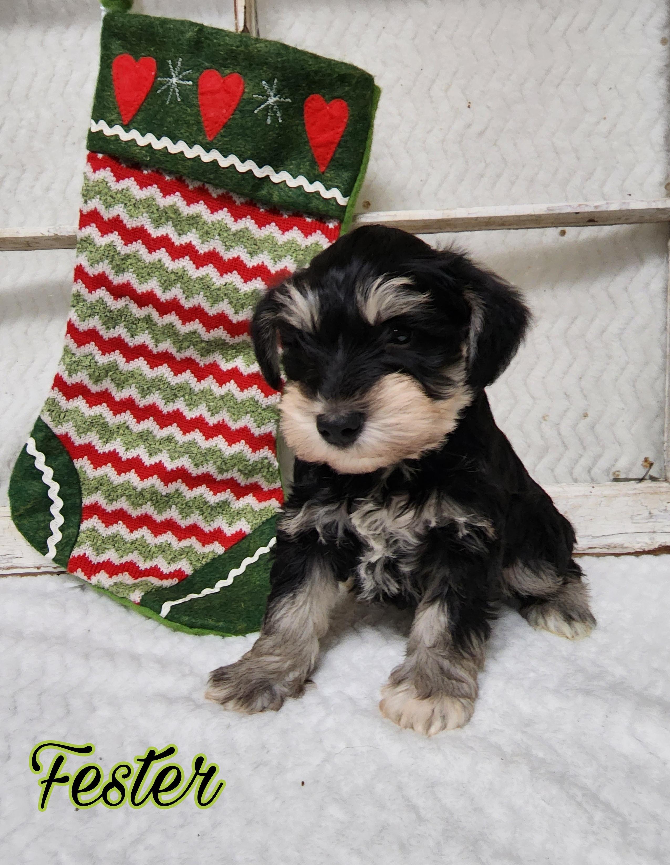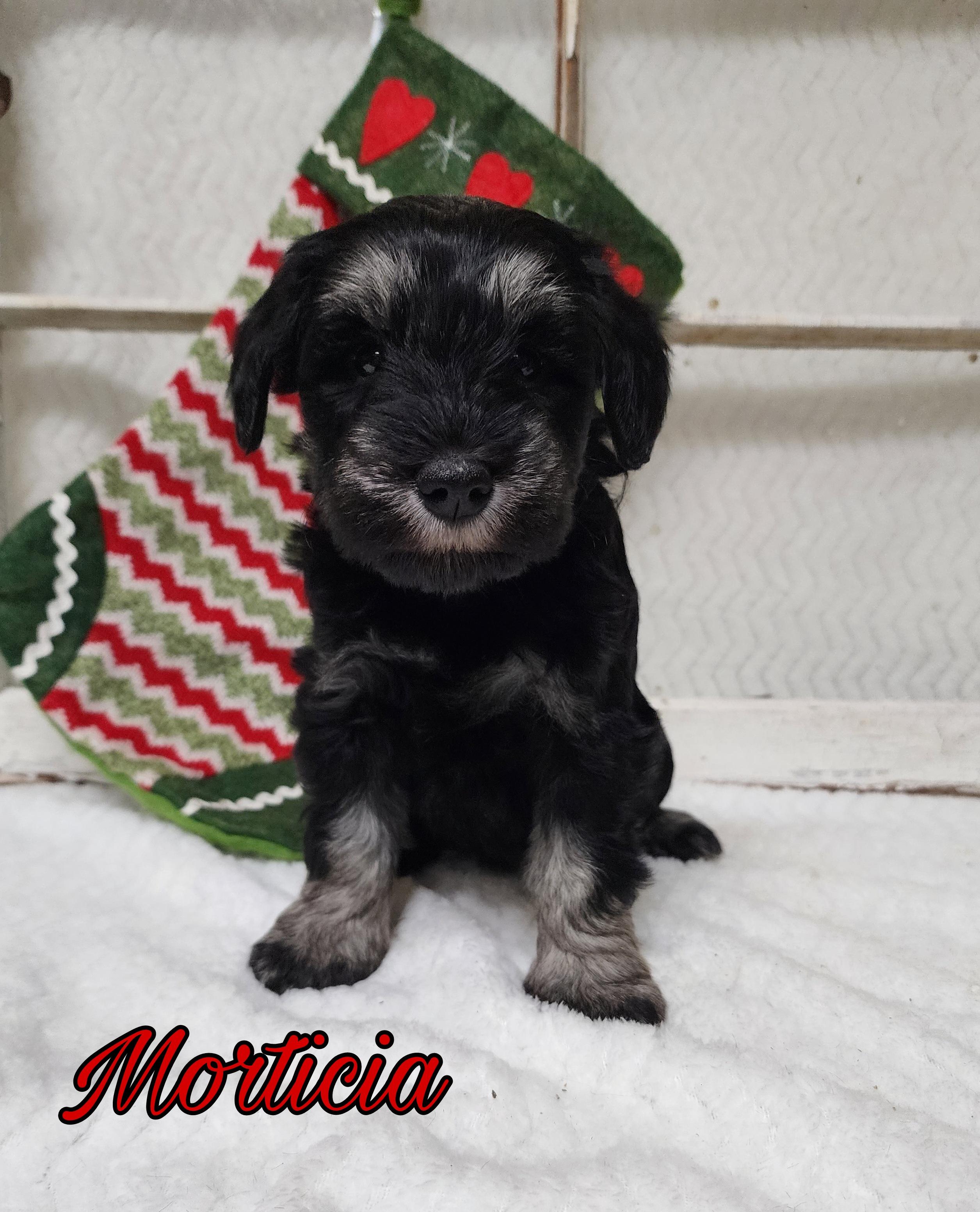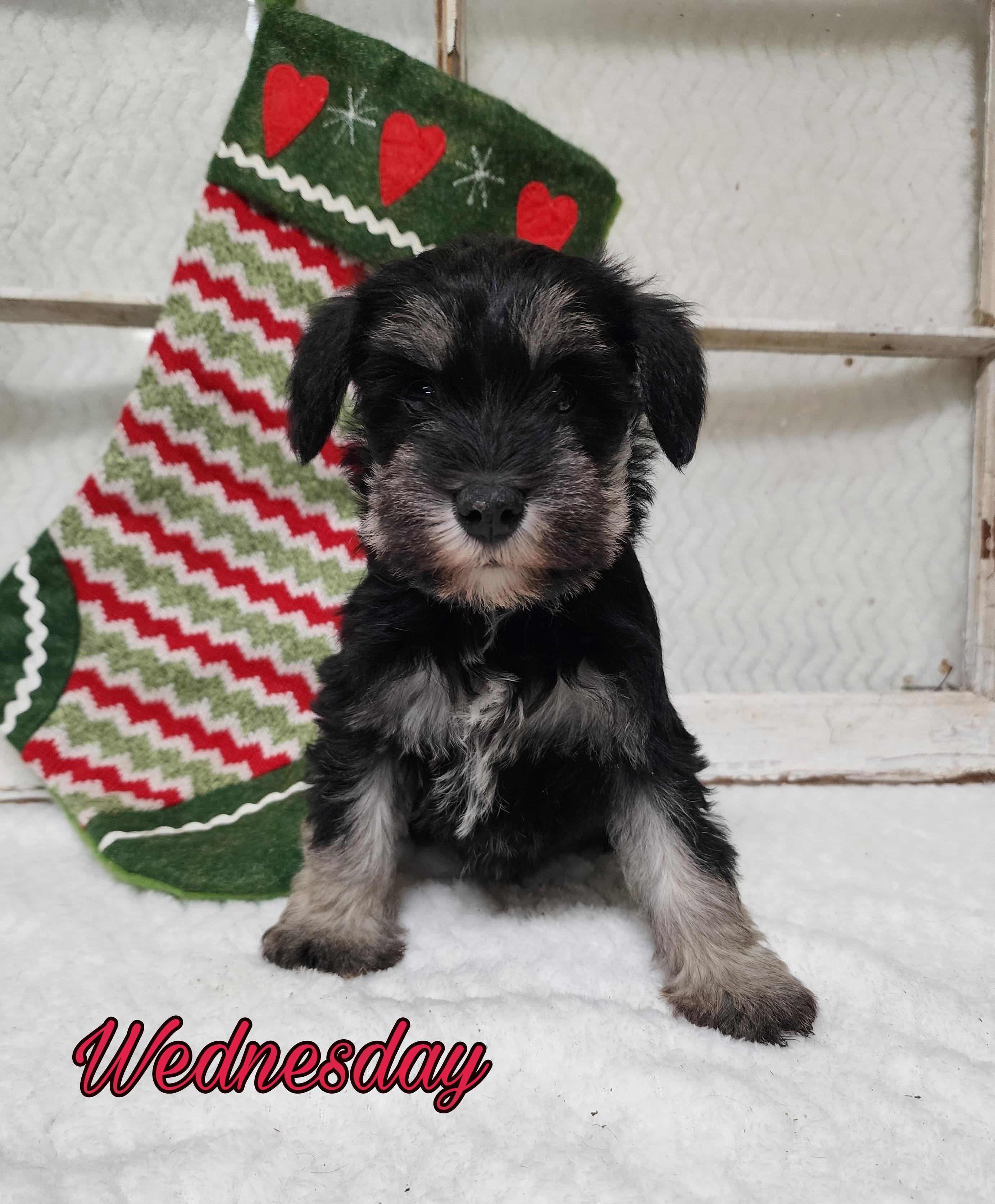 Charlotte is a sweet liver pepper parti mini schnauzer, with green eyes. She is AKC registered and only weighs 9 lbs with a beautiful plush coat. She loves everyone and gets along well with other dogs.