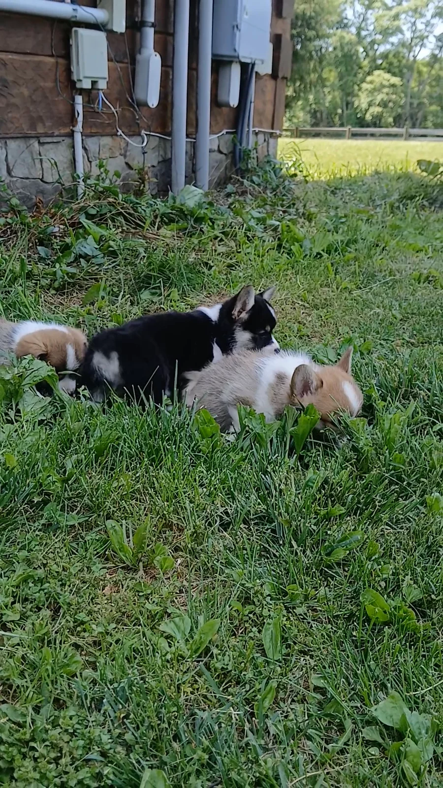 At 7 weeks, these pups are loving their romps outside. They especially love hiding under a certain bush and following the Border Collies.