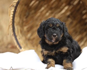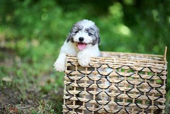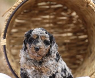 Aussiedoodle puppies include blue merle, red merle, black phantom, and black tri-color. Colors will vary depending on the parent dogs.