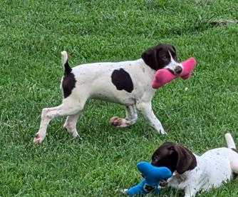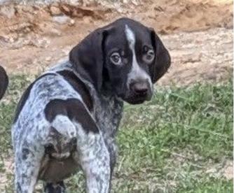Our German Shorthaired Pointer puppies are liver roan. Mastiff puppies include apricot, fawn, and brindle. Colors will vary depending on the parent dogs.