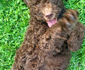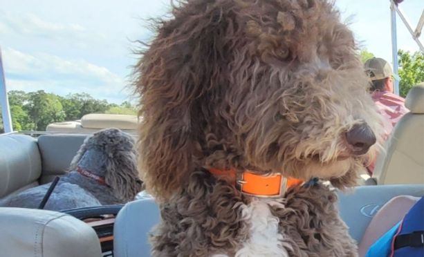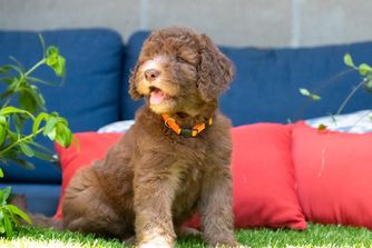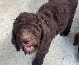 Handsome F1B goldendoodle. 87% Poodle & 13% GR. CKC Registered. Has been with us since 8 weeks old. Raised in our home with May and our family. Loves the water and is a gorgeous liver color with the most beautiful eyes.