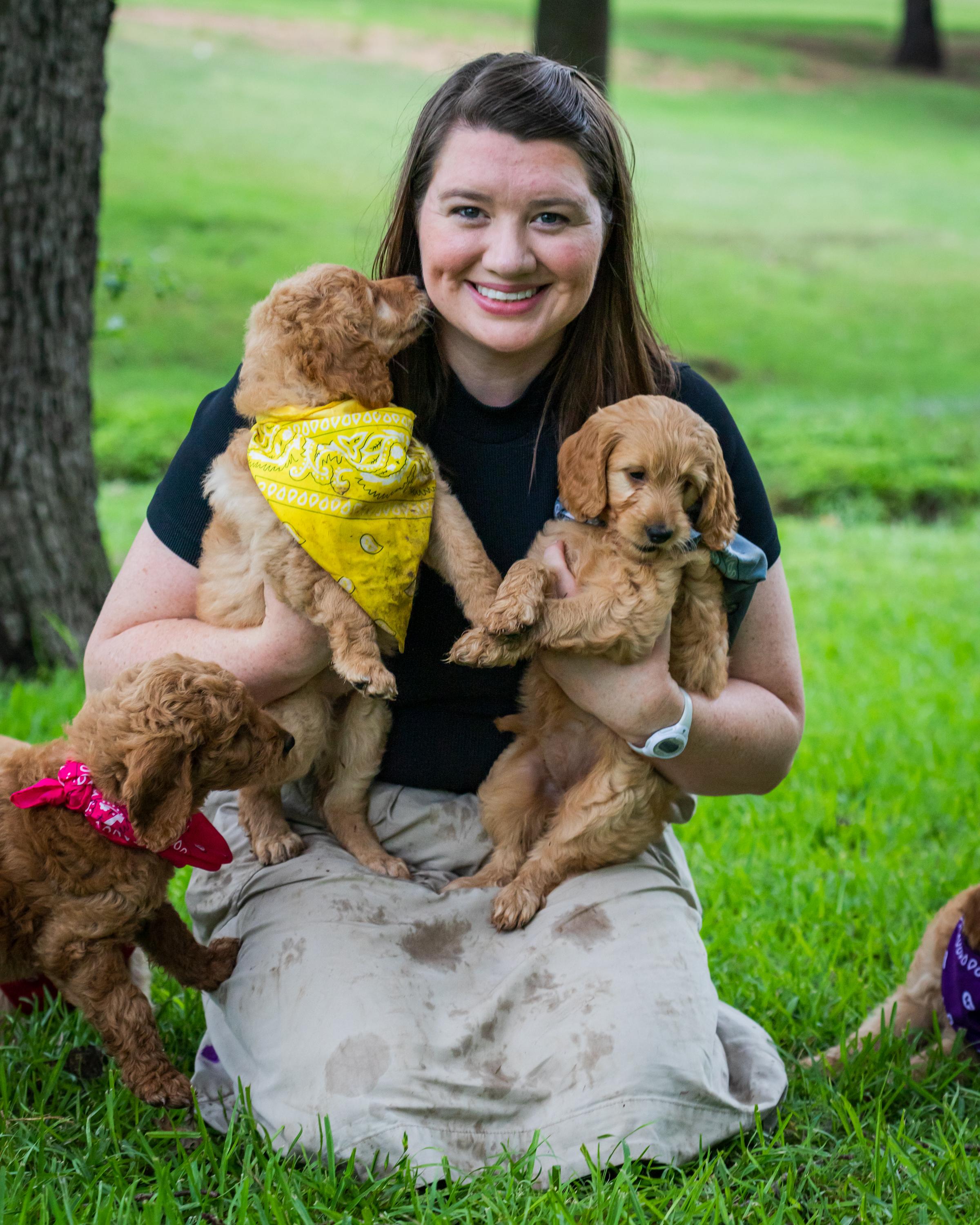 I grew up raising goats, sheep, rabbits, hamsters, chickens, and other farm animals, and reading about animal behavior, health, training, and responsible breeding practices. It has always been my dream to breed dogs. My “first love” dog was a Golden Retriever, and as an adult I wanted to breed Goldendoodles to retain the magic of the Golden personality without the houseful of hair!