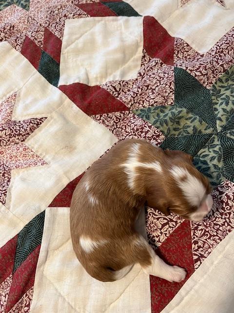 Remi is the BEST mom! She's been devoted to all her puppies in every litter. Like a true Cavalier, she LOVES people! Always the first to greet strangers at the door or outside on walks and trips.
