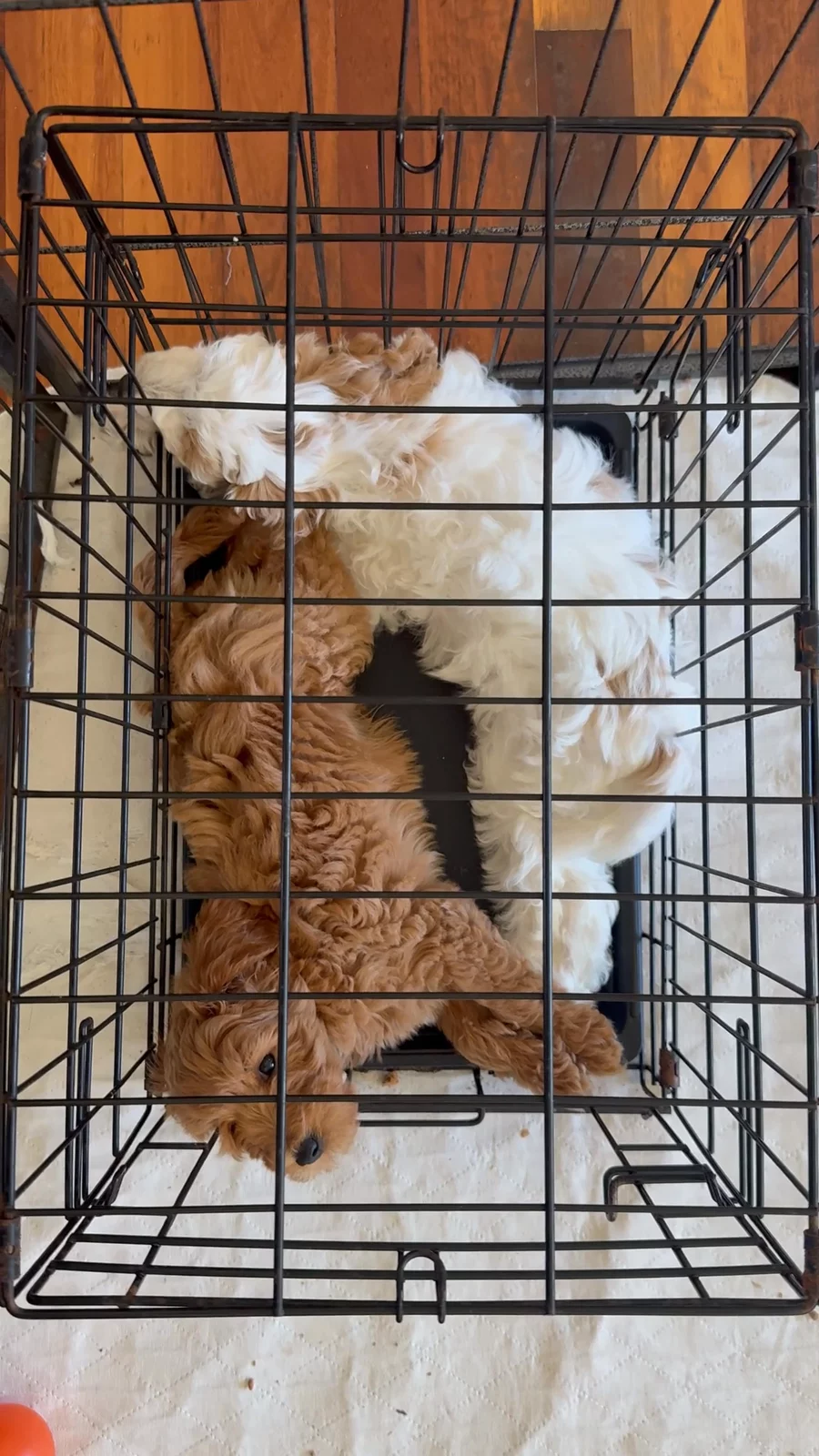 Our last two available boys from Scoop’s litter are crate training themselves 🤣 joking aside, this is how we get our pups comfortable with the crate before go home.
