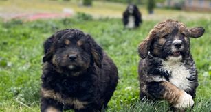 Our Bernese Mountain Dog puppies are tri-color. Bernedoodle puppies include sable, black and white, and tri-color. Colors will vary depending on the parent dogs.