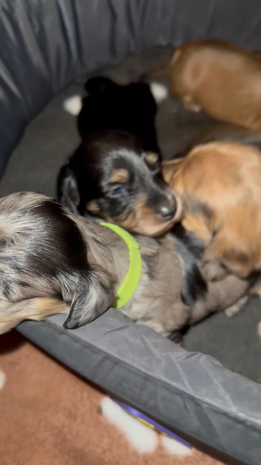 Pups were born exactly on time! 1/1/2026 1 red dapple male, 2 shaded red females, 1 black/cream possibly piebald female , and 1 black/cream dapple female!