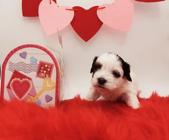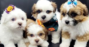 Our Shih Tzu puppies include blue and white and brindle and white. Colors will vary depending on the parent dogs.