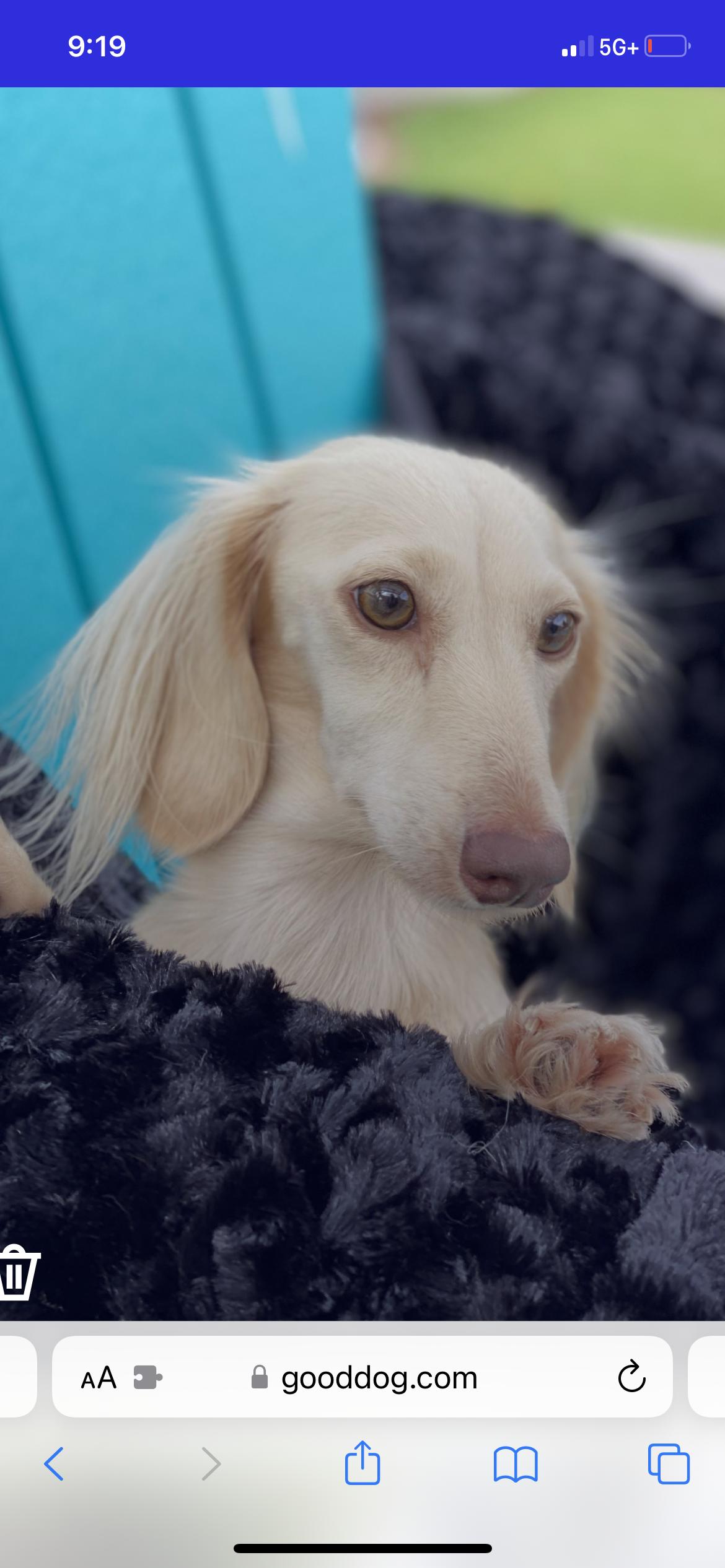 Jax is a male Dachshund. Carefully selected as a great representative of his breed, Karen decided to make him part of their program. Karen has passed Good Dog’s screening process, which involved a review of their breeding practices, environment, and the mental and physical health of their dogs.