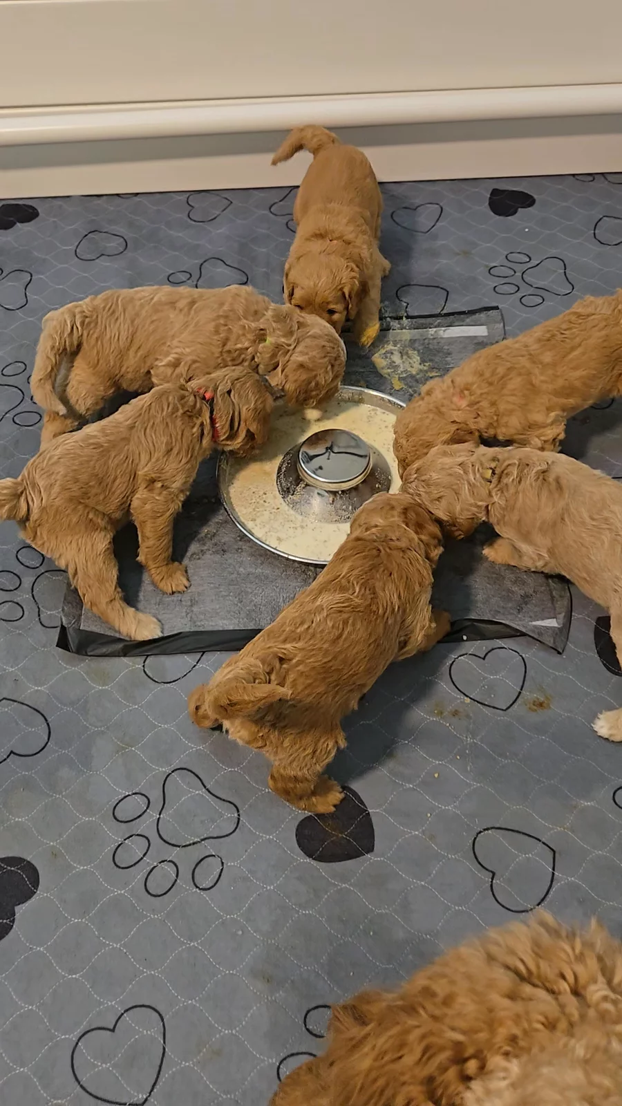 LunaXOliver Lucky Charms Retirement Litter is starting on puppy mush!! I think they liked it!!