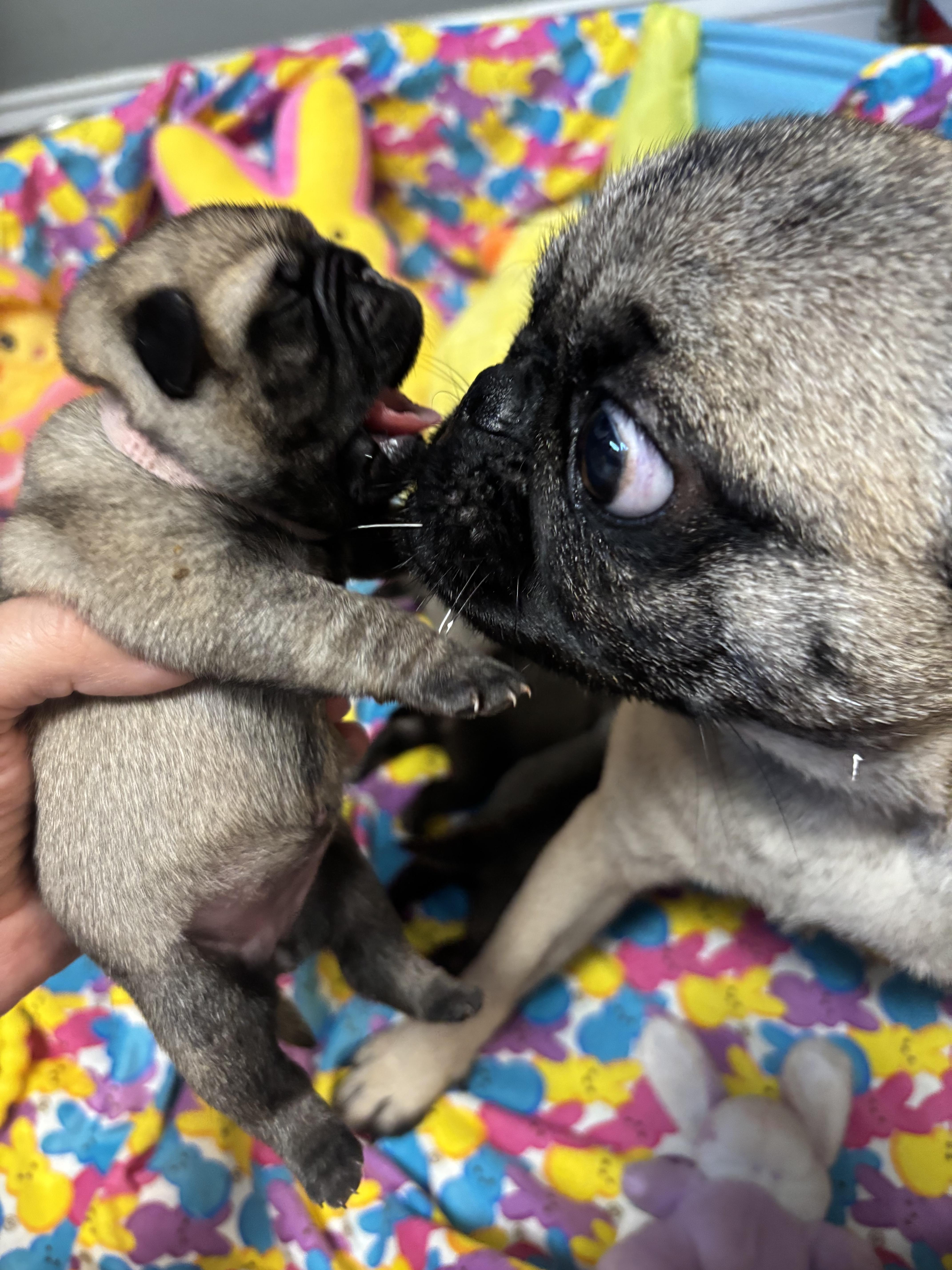 What makes our program special is that our 2 pugs truly are our family. They sleep in our bed, they watch TV with us, travel, & so much more. They are our precious babies. This is Chantilly’s first litter, & they are so well cared for. Chantilly received all necessary prenatal care during her pregnancy with frequent check ups. She took supplements during pregnancy and continues them daily.