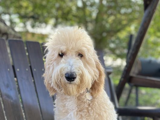 Such a beauty- English Cream F1b Goldendoodle with a very cottony-soft thick straight coat. Emy is a real sweetheart! Very loving with an easy-going laid back personality. She enjoys chasing the tennis ball, bird watching, and snuggling up by your feet at the end of the day.