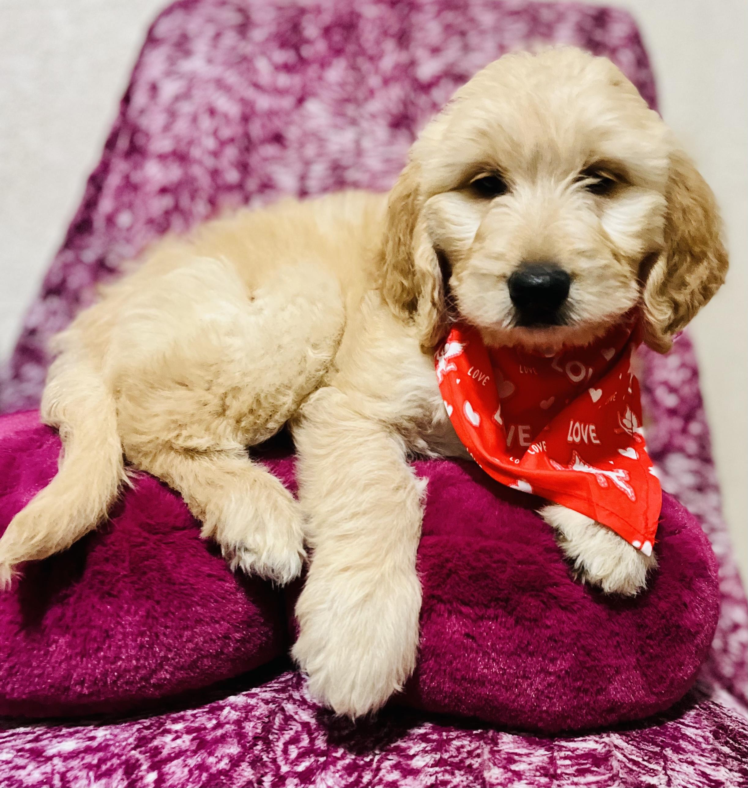 Such a beauty- English Cream F1b Goldendoodle with a very cottony-soft thick straight coat. Emy is a real sweetheart! Very loving with an easy-going laid back personality. She enjoys chasing the tennis ball, bird watching, and snuggling up by your feet at the end of the day.