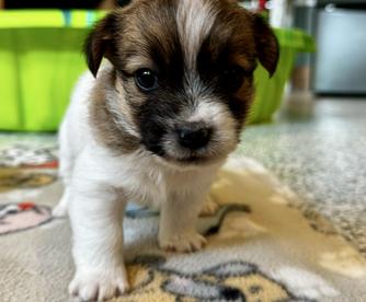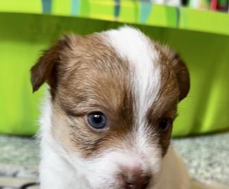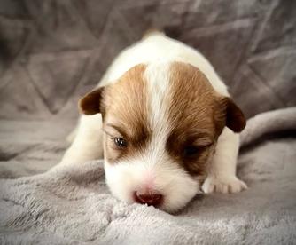 Our Russell Terrier puppies are white and tan. German Shorthaired Pointer puppies include liver roan and black roan. Colors will vary depending on the parent dogs.