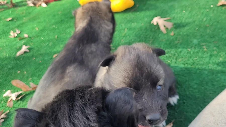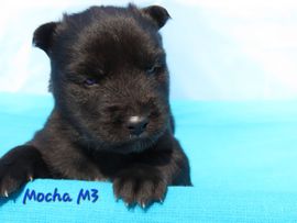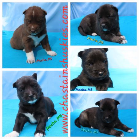 3 week old pix are posted of Ragnar/Mocha pups. All pups have bright blue eyes.