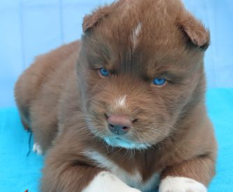 Mocha is mostly red, with blue eyes. AKC.