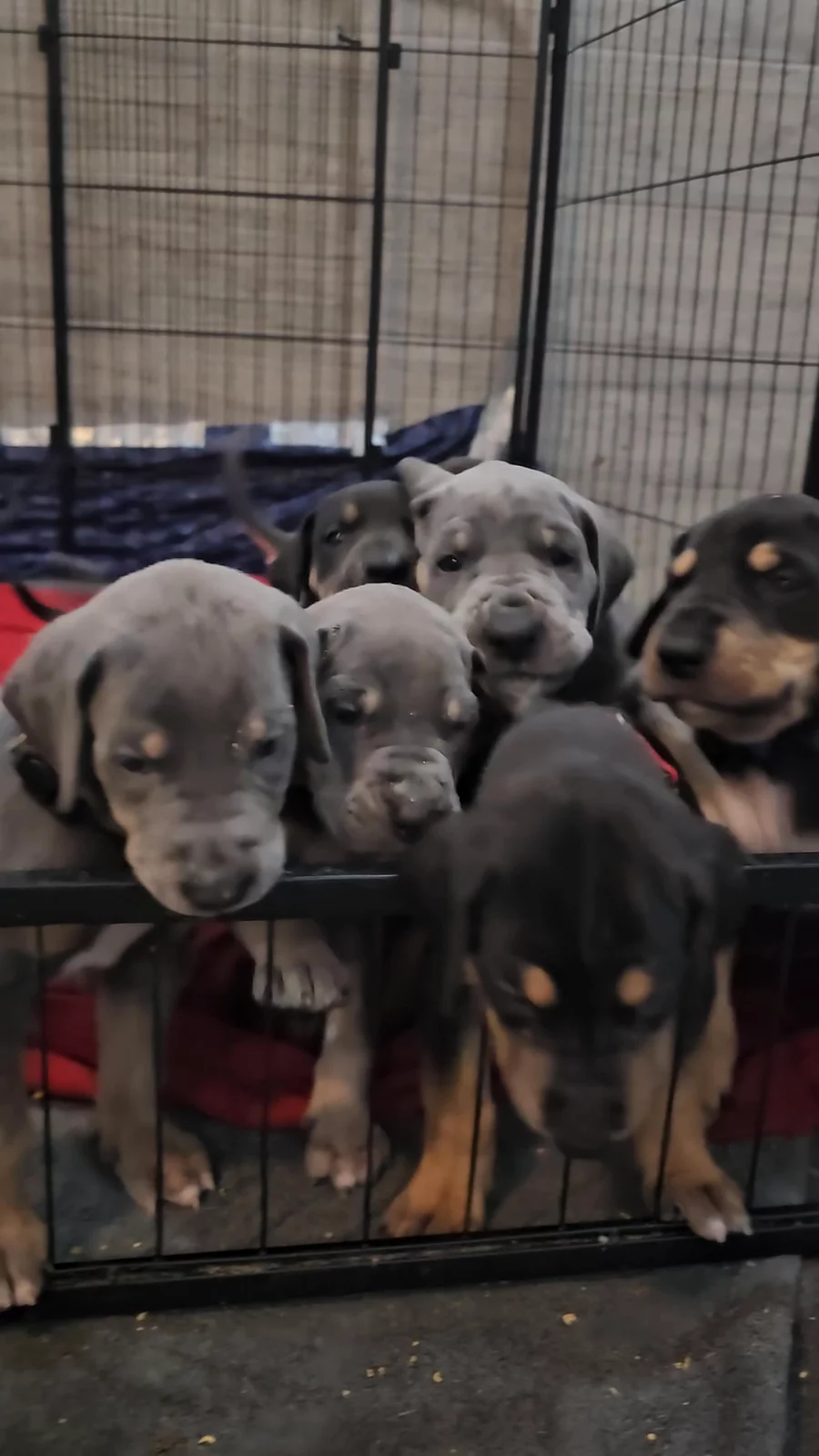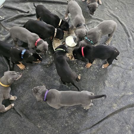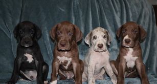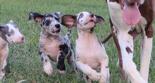 Our puppies include chocolate and white, silver, chocolate, blue, harlequin, merle, and black. Colors will vary depending on the parent dogs.