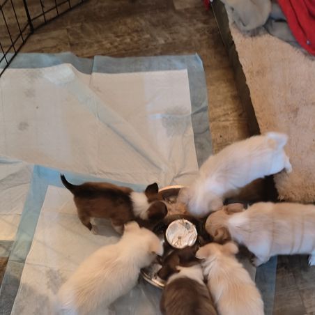 They are eating 🍴 wet NutriSouce can puppy food mixed with Goats Milk. Momma is slowly weaning them off.