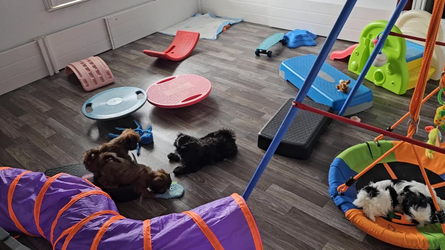 Stephanie & Alyssa were so helpful, responsive and clearly care about their puppies. The puppy playground is amazing for them to learn so much before getting to their new home. My baby Leo is already using the bathroom mostly outside, getting along so well with his new big brothers and sleeping through the night. They are well cared for and that is obvious!!