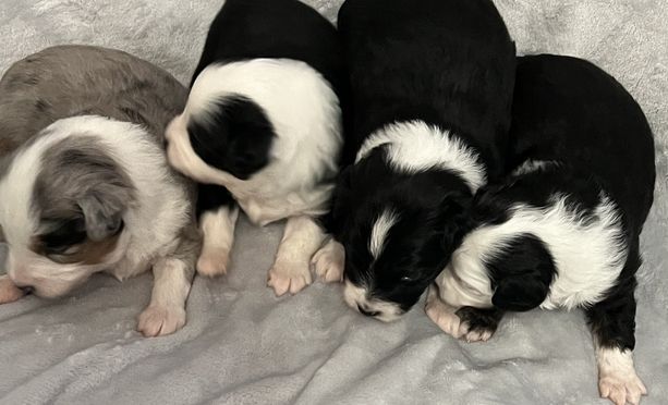 Our Miniature Australian Shepherd puppies include blue merle and black. Toy Australian Shepherd puppies include black and blue merle. Colors will vary depending on the parent dogs.