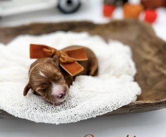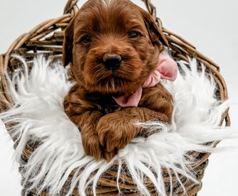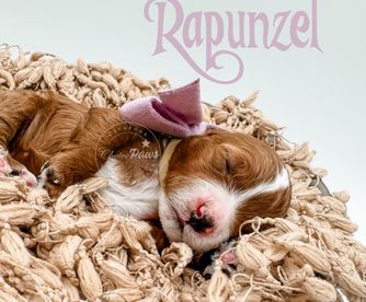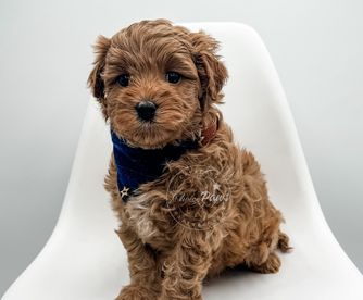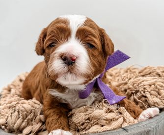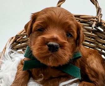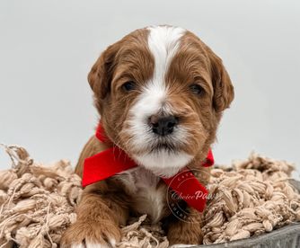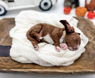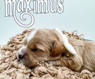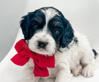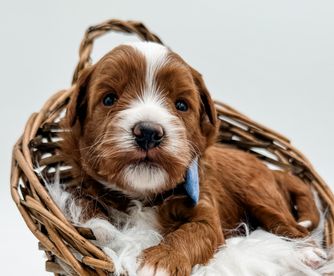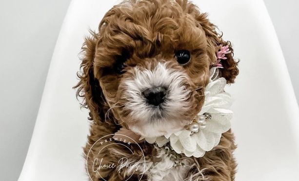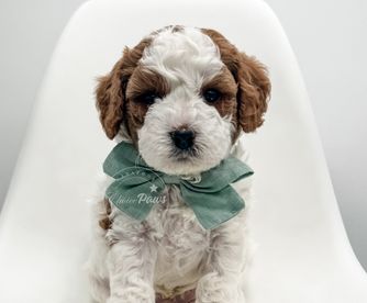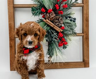Our Cavapoo puppies include blenheim, black and white, and red. Goldendoodle puppies include cream, apricot, red, and parti. Colors will vary depending on the parent dogs.