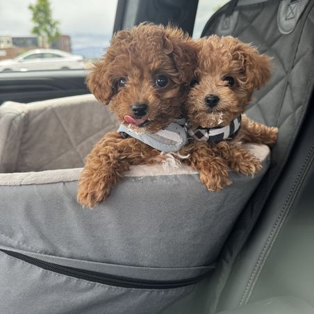 Our Cavapoo puppies include toy and miniature sizes. Goldendoodle puppies are petite size. Sizes will vary depending on the parent dogs.