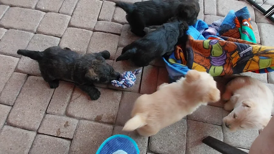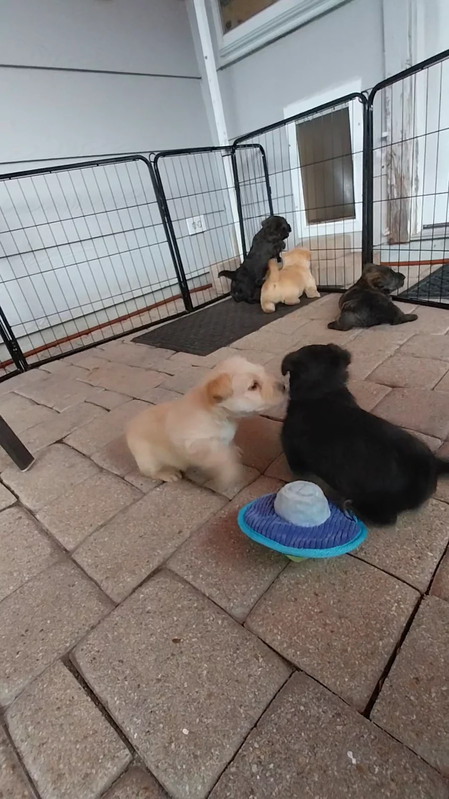 The puppies are 4 weeks old now, my how time flies. Walking, playing, growling, eating, checking out the doggy door and a couple are actually hitting the potty tray!