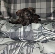 My cuties are born in our home with our love and attention. We have a brindle male available. He is a little snuggles. I started Kennel training at night next to my bed. He has the cutest little barking conversations with me.