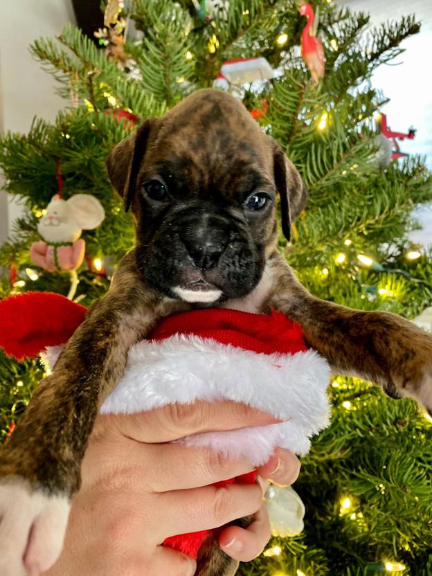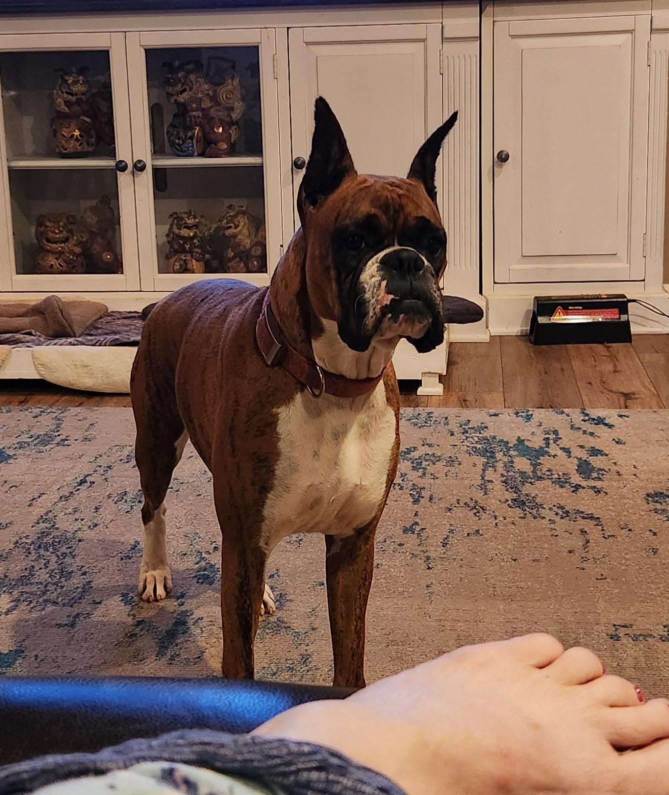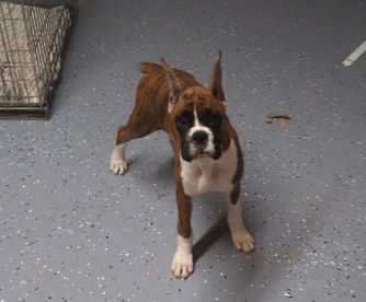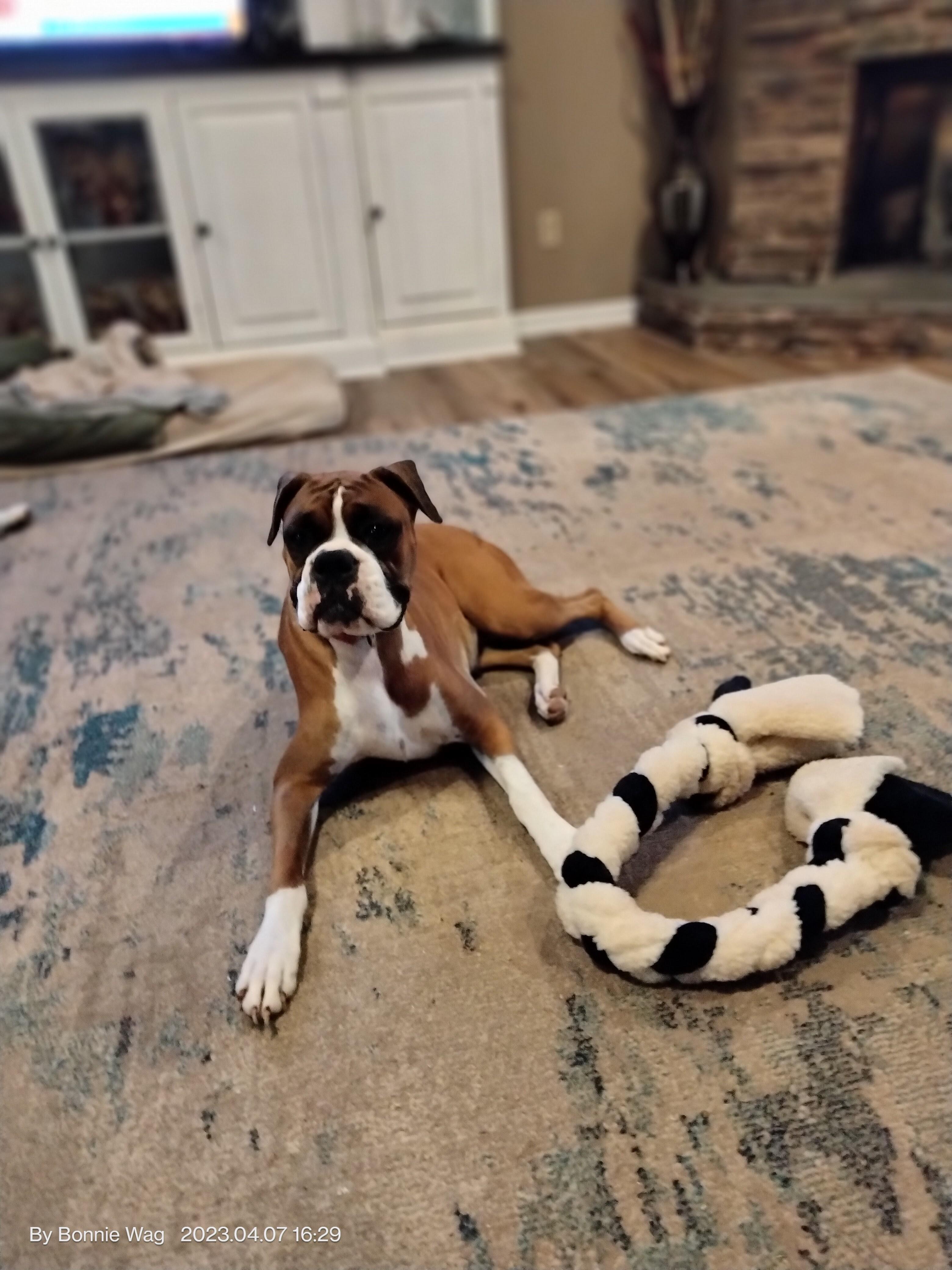Cinnimon is a female Boxer. Carefully selected as a great representative of her breed, Bonnie decided to make her part of their program. Bonnie has passed Good Dog’s screening process, which involved a review of their breeding practices, environment, and the mental and physical health of their dogs.