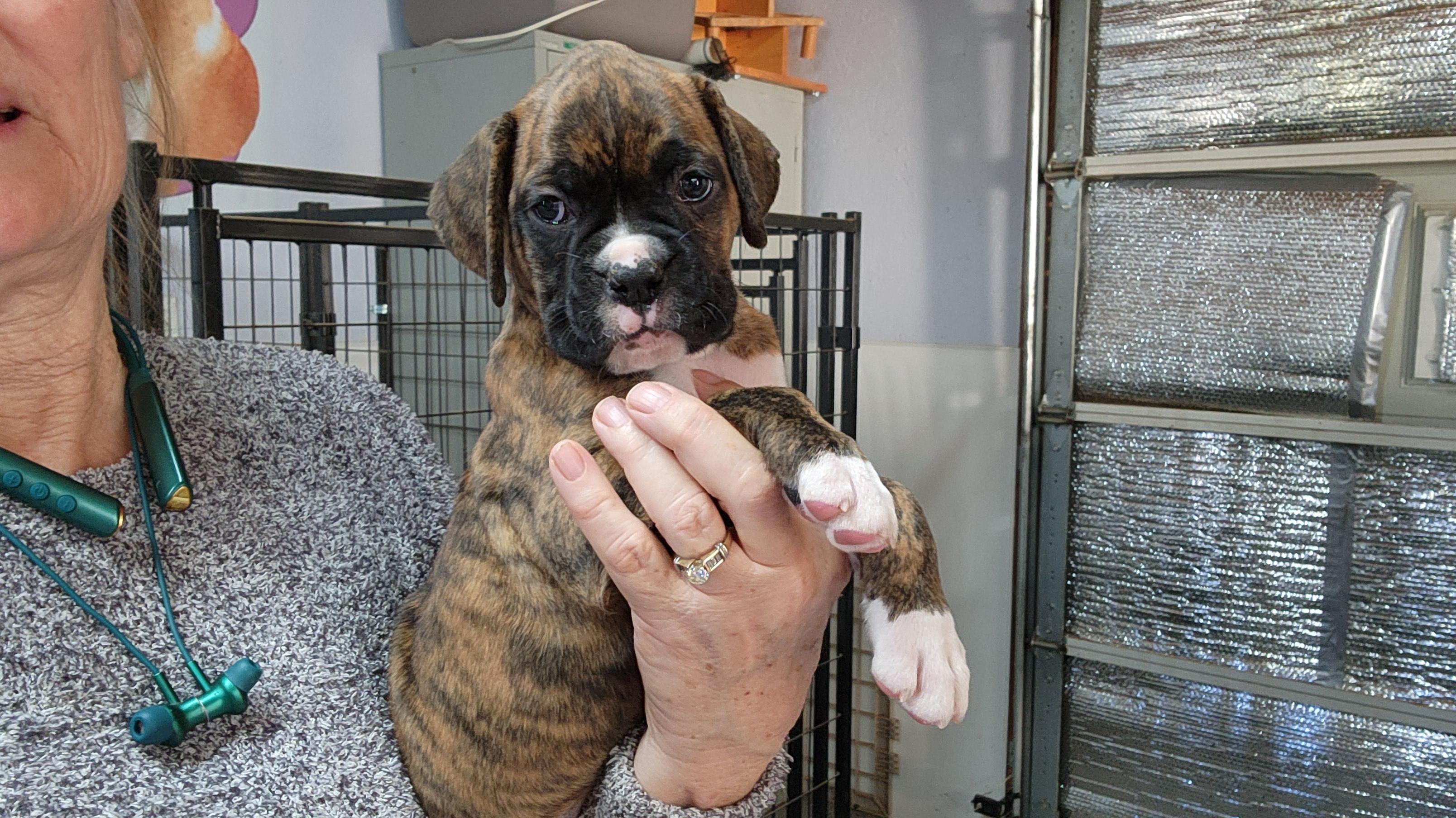 Belle is a female Boxer. Carefully selected as a great representative of her breed, Bonnie decided to make her part of their program. Bonnie has passed Good Dog’s screening process, which involved a review of their breeding practices, environment, and the mental and physical health of their dogs.