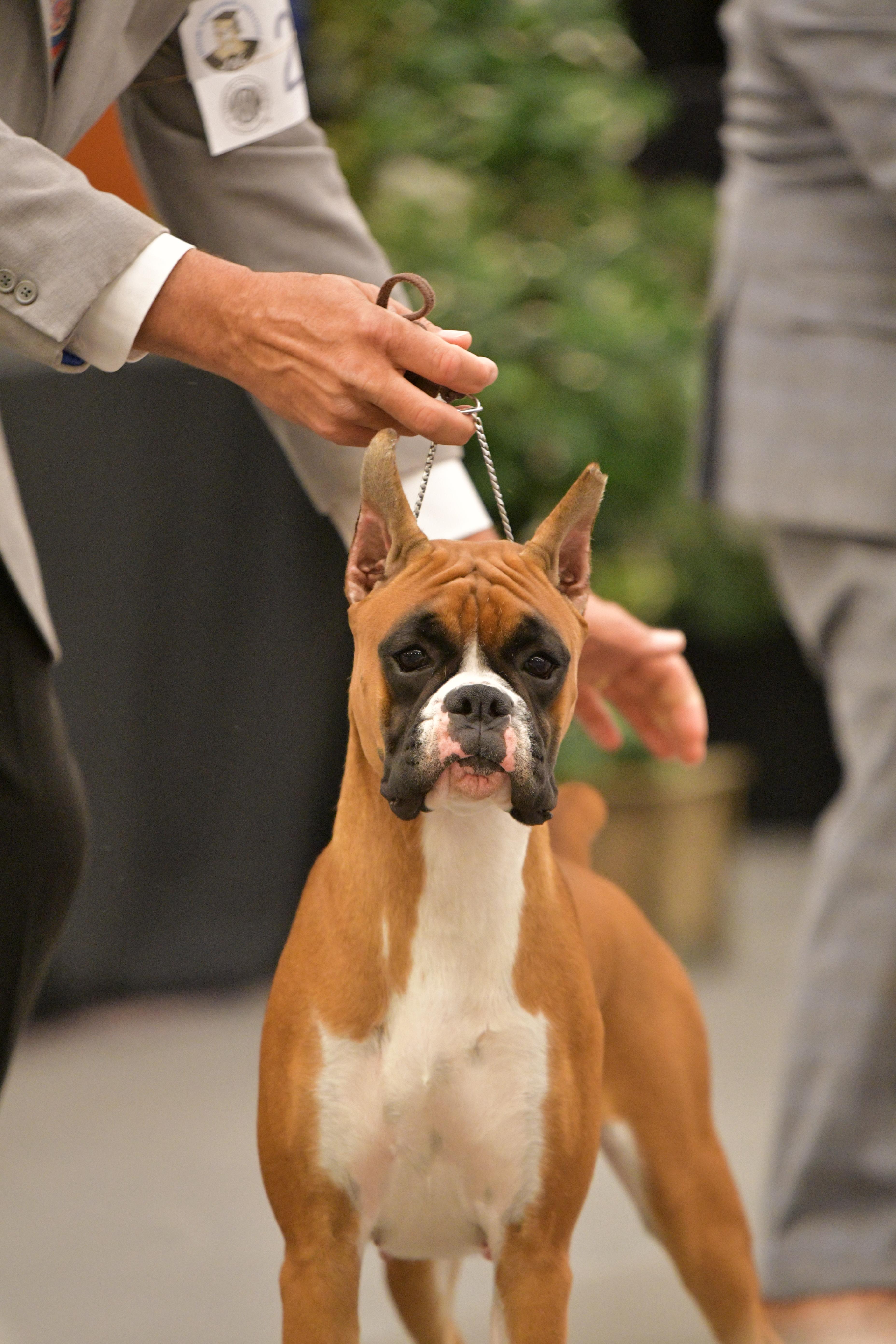 Dealer is not only a handsome boy, he is goofy and sweet. We are very excited about him, as he is doing amazing things in the show ring. He finished his championship at the American Boxer Club National, going Best of Winners from the 9-12 class. His first month out as a special, he went Best of Breed over top winning, Best In Show boxers. He ended his first month in the Top 5 of the breed. This is his first litter and it was an exceptional litter. all the puppies have beautiful conformation and temperament. Can't wait to see what else he produces.