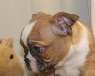 Honey is a female Boston Terrier. Carefully selected as a great representative of her breed, Emily decided to make her part of their program. Emily has passed Good Dog’s screening process, which involved a review of their breeding practices, environment, and the mental and physical health of their dogs.