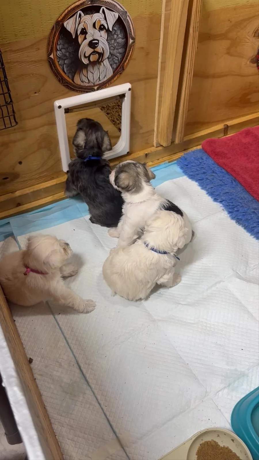 We believe in quality, not quantity. At Circle R Ranch, we have 50 acres of property to allow the dogs ample room for exercise and playtime. We keep the puppies inside for the first 4 weeks. After this we move them to our building where they have heat and AC. They are pad trained and leave knowing how to go out a doggy door. Micro chipped, 2 out of 4 shots.