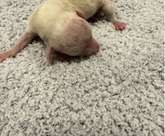 Riley is our cuddly, feisty, belly-rub loving cream piebald. She is always happy to follow us around, sit at the kitchen table, and snuggle in a lap.